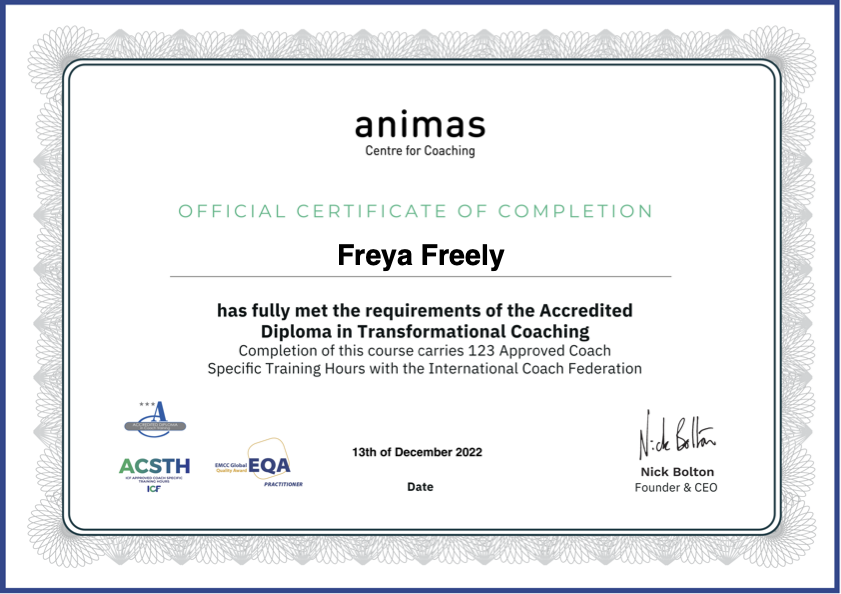 Finding limited relief for herself from stress and burnout via traditional therapy, Freya discovered coaching in 2020, and a new way of seeing herself and life opened up.  Experiencing a new sense of clarity and confidence inspired her to help others to create the same inner freedom for themselves.